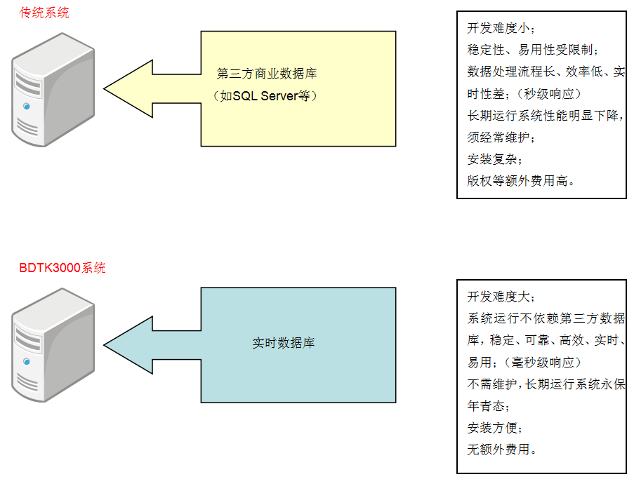 早期的機房監控軟件及目前行業(yè)內不少廠(chǎng)家的機房監控軟件,仍采用第三方數據庫(Server SOL、MySOL等)作為數據處理存儲核心來(lái)搭建整個(gè)系統,而按照國際上通用要求的采用實(shí)時(shí)數據庫的機房監控軟件確鳳毛麟角。那么機房監控系統采用實(shí)時(shí)數據庫和第三方數據庫區別何在呢?我們用示意圖來(lái)簡(jiǎn)單對比一下。